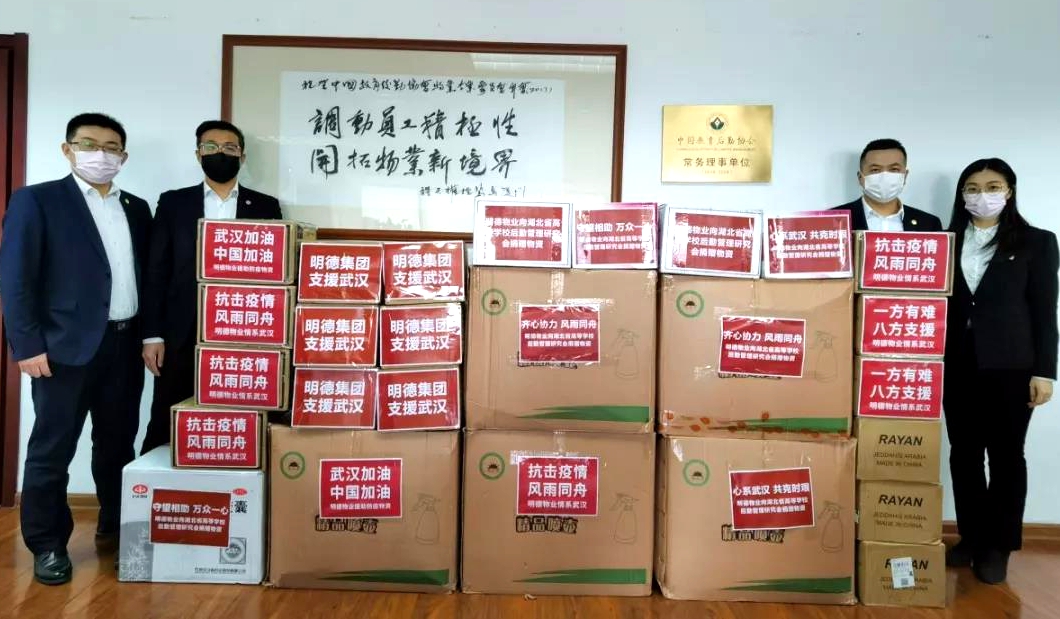 守望相助,共克时艰。明德物业在做好自身工作的同时,不忘向一线奋战的英雄们致敬,并尽力献出自己的一份力量。在集团党委书记、董事长刘德明的指示下,集团抽调精干力量多方筹措物资,于1月28日下午5点,筹集到首批捐赠物资:口罩10000只,手套4000只,喷壶500个,药品400盒,定向捐赠武汉市物业管理协会。2月10日,明德物业再次驰援湖北,筹集到捐赠物资:医用手套20000只,喷壶1000个,药品400盒等物资,定向捐赠湖北省高等学校后勤管理研究会。